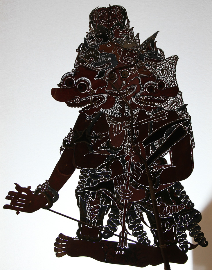 Vorschlag DS: Rahwan in der Brahala-Form. Identifizierung dieser Figur durch Freek Bracke und Dalang Langen Bradanaya als Buta Sewu. Buta Sewu oder Brahala Sewu ist ein furchterregender Riese. Es handelt sich um eine zornige Inkarnation von Kresna, während seines Triwikrama. Brahala Sewu ist ein tausendgesichtiger Riese, der die Wolken überragt. Man glaubt, dass Krishna selbst in seiner Brahalasewu-Gestalt seine Emotionen noch beherrschen kann. Kresna nahm einmal eine solche Form an, und dabei kamen Soldaten und einige Kauravas, die sich aus eigenem Verschulden gegen Brahala Sewu stellten, zu Tode. Dennoch schützte Kresna, der mit seiner Macht ein ganzes Land hätte zerstören können, die Bevölkerung. Es ist noch ungeklärt, ob diese Figur wirklich Buta Sewu ist. Andere Theorien sind eine Brahala-Form von Dasamuka/ Rahwana oder eine Form von Kumbakarna. Weitere Hinweise willkommen.
