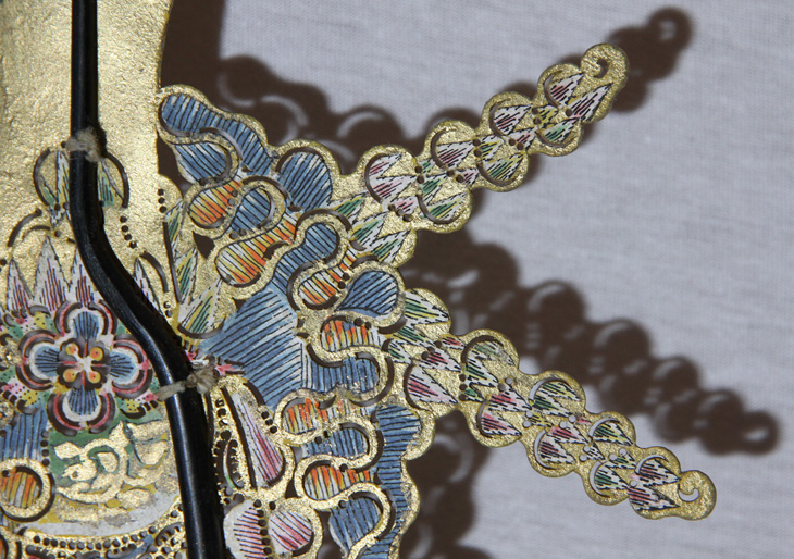 Vorschlag DS: Sumantri. Das ergäbe nach dem Schematismus von Franke-Benn den Typus 1-1-40.502.6.7. Mit dieser Nummer gibt es Raden Samba, aber mit erhobenem Blick. Die vorliegende Form fehlt in der Liste von Franke-Benn. Bei ihr ist Sumantri weitab mit 1-3-40.60.7, also mit dem aus vielen herabhängenden Teilen bestehenden Hüfttuch und mit dem abstehenden Schmuck hinter dem Ohr, ohne Garuda und ohne Diadem. Bei Moog entspricht die Zeichnung dem Schema 1-3-40.501.6.701, also wieder anders. Die oben abgebildete Figur wurde von Dalang Langen Bradanaya hingegen als "Docang" identifiziert - es gibt keine Figur mit diesem Namen, nur etwas zu essen.