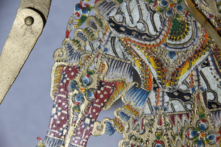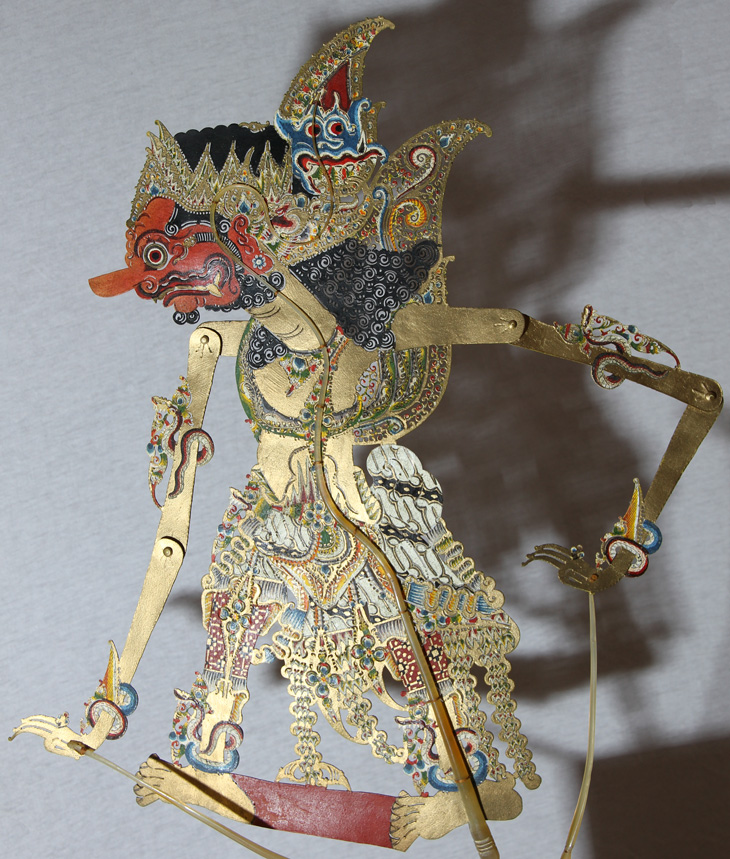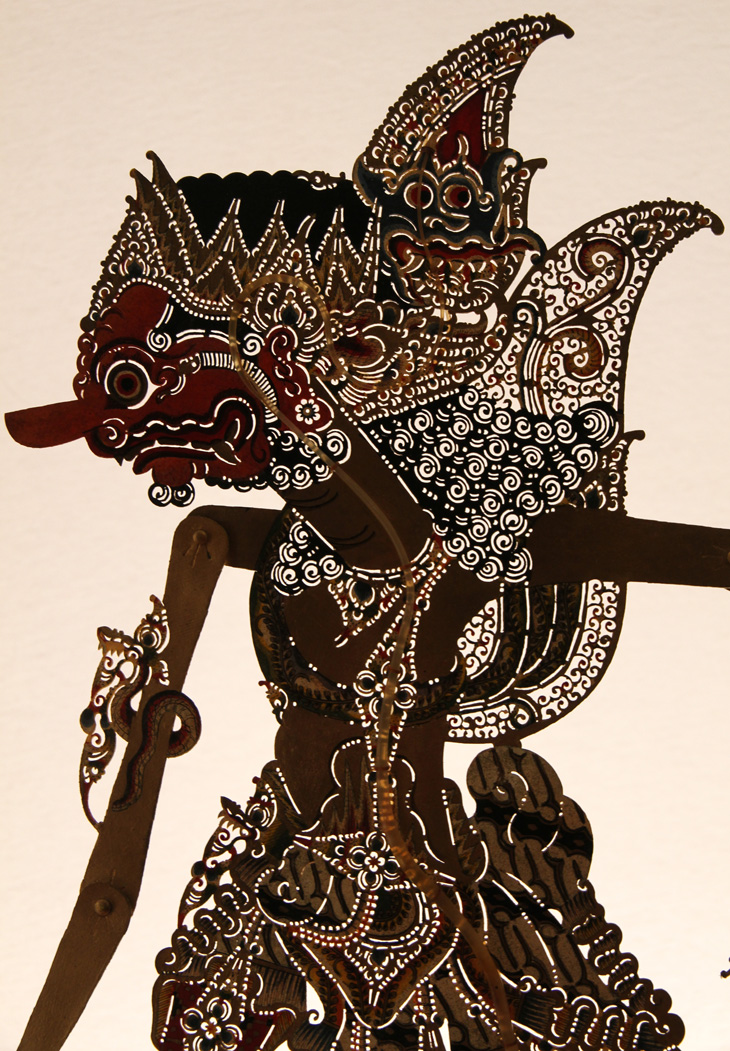 Die abgebildete Figur hat nach dem Franke-Benn-Schematismus den Typ 3-3-1.43.503.60.70. Rote Gesichtsfarbe, Blick leicht gesenkt. Nach dem Franke-Benn-Schematismus kommen dafür drei Charaktere in Frage, 1.) Prabu Rahwana Raja, mit gesenktem Blick, 2.) Prabu Gardapati, mit geradem Blick, und 3.) Raden Dewatumut, mit leicht gesenktem Blick. Die meisten Darstellungen von Rahwana zeigen ihn mit Mahkota, aber es gibt auch solche ohne, die dieser Figur entsprechen. Die meisten Darstellungen von Gardapati zeigen ihn ohne Mahkota, es gibt Varianten ohne offenes Haar und mit erhobenem Blick. Beide Figuren haben die sichtbaren Fangzähne. Über die dritte Option, Dewatumut, ist nichts herauszubekommen. Die hier gezeigte Figur hat einen deutlich gesenkten Blick. Der nächste Vorschlag lautete Duryodana. Eine weitere Identifizierung erfolgte durch Dalang Langen Bradanaya als "Brajadenta". Franke-Benn gibt für Brajadenta an: 30-3-423.502.6.70, was in mehreren Kriterien von der vorliegenden Figur abweicht. Vorschlag DS: Duryodana, Suyudana. Wegen der vielen Vorschläge, von denen sich keiner anhand des Vergleichsmaterials durchsetzen kann, bliebt die Figur weiterhin offen.