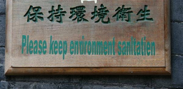 Vorweg - falls ich mal den Versuch unternehmen sollte, deutsche Botschaften in das Chinesische zu übersetzen, werde ich den Chinesen vermutlich noch viel, viel mehr Anlaß zu Heiterkeit geben. Vielmehr bewundere ich das Bemühen, es den Langnasen einfacher zu machen, sich zurechtzufinden. Aber einige englische Botschaften im öffentlichen Raum, hauptsächlich aus Pingyao, aber auch von anderen Orten, erfüllen doch so sehr das Herz mit spontaner Freude, daß sie hier gezeigt werden sollen: Nicht Denglisch, sondern Chinglish!