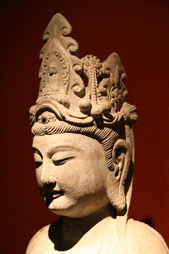 Abb. links und rechts: steinerne Figur des Boddhisattva Mahasthamaprapta aus der Zeit der Sui-Dynastie (581-618 n. Chr.)