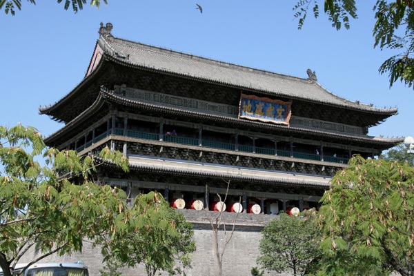 Im Stadtzenttrum von Xi'an befindet sich das für chinesische Städte charakteristische Paar ("Zwillinge") aus Glockenturm und Trommelturm, beides groß dimensionierte Signaltürme mit zwei verschiedenen Signalinstrumenten. Der 33 m hohe Trommelturm wurde auf rechteckigem Grundriß von 52,6 m Länge und 38 m Breite errichtet, mit einer zentralen Durchfahrt im steinverkleideten, 7,7 m hohen Sockelgeschoß. Auf der gemauerten Plattform, zu der an der Schmalseite Treppen hochführen, ist eine Holzkonstruktion mit drei Dachebenen errichtet worden, mit einer ganzen Galerie von Trommeln rings um das unterste Stockwerk, und mit einer offenen Galerie zwischen erster und zweiter Dachebene. Abends gab das Signal den Befehl zum Hochziehen der Zugbrücken und zum Verschluß der Stadt. Außerdem wurde vom Trommelturm aus Alarm gegeben, denn auch hier war schnelles Hochziehen der Zugbrücken das Gebot. Der Turm steht westlich vom Glockenturm in Sichtweite von diesem und etwas zurückgesetzt in der Nähe einer der Hauptverkehrsstraßen, die durch die Altstadt von Xi'an in West-Ost-Richtung führen, und es erscheint angesichts des Verkehrsgetöses fraglich, ob heute die Signale wohl weiter als 100 Meter vernehmbar wären. Das hölzerne Gebäude ist Ming- und Qing-zeitlich, aber stilistisch ganz Ming-zeitlich, denn der Erstbau erfolgte 1380, dann folgten Restaurierungen 1699 und 1740.