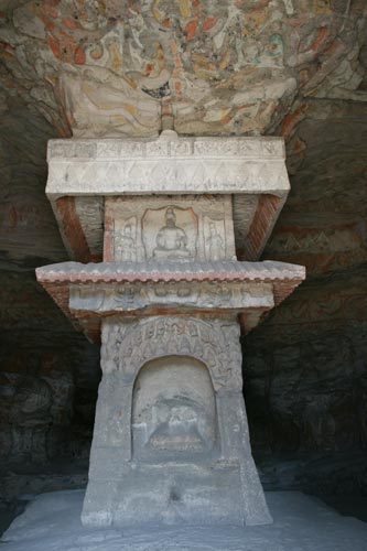 Höhle Nr. 1 ist ca. 471-494 AD entstanden. Sie ist rings um einen zentralen, stupaähnlichen Pfeiler herum aus dem weichen Fels gehauen worden. Dieser Pfeiler von quadratischem Querschnitt imitiert mit seinen zwei verschiedenen Etagen und Dächern eine typisch chinesische Pagode. Der Grundriß der Höhle ist rechteckig; die Decke ist relativ niedrig. Die am östlichsten Ende der ganzen Gruppe gelegene Grotte ist insgesamt von eher schlechter Erhaltung. Das wichtigste Bild an der Nordwand ist eine Darstellung des Maitreya-Buddha (Buddha der Zukunft). An der östlichen Wand ist unten in Form eines Reliefs eine Jataka zu sehen (wörtl. Geburtsgeschichte, eine Lehrgeschichte aus Buddhas Leben) über Samaka (kindliche Liebe und Fürsorge für die Eltern).