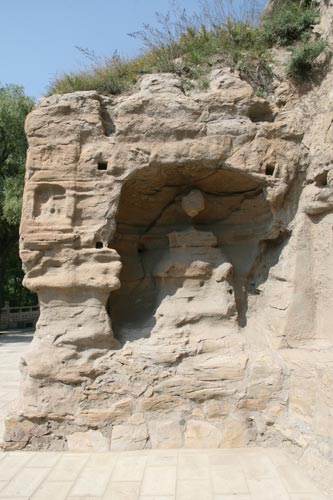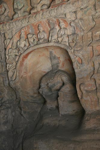 Höhle Nr. 2 ist ca. 471-494 AD entstanden. Sie ist rings um einen zentralen, stupaähnlichen Pfeiler herum aus dem weichen Fels gehauen worden. Dieser Pfeiler von quadratischem Querschnitt imitiert mit seinen drei verschiedenen Etagen, den drei Dächern und der umlaufenden Galerie im oberen Stockwerk eine typisch chinesische Pagode. Der Grundriß der Höhle ist rechteckig; die Decke ist relativ niedrig. Die Grotte ist insgesamt in schlechtem Zustand wie die ganze Gruppe der Höhlen 1-4. An der Oberkante der vier Wände sehen wir Nischen mit himmlischen Musikanten. Darunter sind Reihen meditierender Buddhas. Weiter unten folgen die großen Nischen mit den Kultbildern und ihren sie umgebenden szenischen Reliefs, von padodenartigen Strukturen getrennt, und ganz unten sind Stifter dargestellt. Die unterste Zone ist schwer zerstört. Das wichtigste Bildnis befindet sich an der Nordseite und stellt einen Buddha Sakyamuni (historischen Buddha) dar, er ist leider ebenfalls stark verwittert.