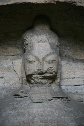 Die Höhlen Nr. 21-53, links von der offenen Höhle mit der wunderschönen Buddhastatue Nr. 20 gelegen, stammen aus späterer Zeit als der rechte Teil des Ensembles. Sie sind alle kleiner und künstlerisch weniger qualitätvoll, mehr Masse statt Klasse. Das lag daran, daß die Wei-Dynastie ihre Hauptstadt Datong verlassen hatte und nach Luoyang gezogen war als neuem Regierungssitz. Deshalb setzte sich die große Kunst dort in den Luoyang-Grotten fort, während hier in der Nähe zu Datong kein Geld mehr ausgegeben wurde. Genau so sehen die Grotten auch aus. Es gibt keine Monumantalstatuen mehr, selten umfaßt die Grotte mehr als einen Raum, und das, was existiert, verdanken wir den Stiftungen reicher Bürger, die so etwas für ihr gutes Karma tun wollten. Manchmal werden solche Namen durch Inschriften ausgewiesen. Dennoch kann man auch in diesen Grotten das ein oder andere schöne Objekt entdecken, einzelne schöne Gesichter, aus dem Fels geschlagene Kasettendecken mit Apsaras etc., auch wenn die Qualität deutlich gegen die anderen Grotten 1-20 abfällt und der Erhaltungszustand allgemein dürftig ist. Eine Grotte sticht besonders hervor, weil sie vom Typ der Mittelpfeilerhöhle ist mit einem reichverzierten pagodenartigen Zentralpfeiler.