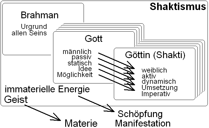 Oder formulieren wir das noch abstrakter: Wir nennen Gott eine unergründliche Energie, die immateriell ist und Großes hervorzubringen in der Lage ist. Wenn sich diese Energie manifestiert, sprechen wir von Schöpfung. Die Idee, die in der göttlichen Energie enthalten ist, wird dabei sichtbar, existent, materiell. Schöpfung beschreibt also den Übergang vom Geistzustand in den Materiezustand. Die Idee ist statisch immer vorhanden. Die Schöpfung dagegen ist ein dynamischer Prozeß. Die göttliche Energie gibt es also in statischer Form (männliches Prinzip) und in dynamischer Form (weibliches Prinzip, Shakti). Erst wenn die göttliche Energie in die dynamische Form übergeht, kann Schöpfung stattfinden. Ein Gott verkörpert das kosmische Bewußtsein in unbeweglichem Zustand, seine Shakti repräsentiert das kosmische Bewußtsein (Brahman) in dynamischem Zustand. Ein Gott existiert als Bewußtseinskraft des Universums, als Möglichkeit und Idee der Schöpfung. Shakti manifestiert sich als Energie, Denkfähigkeit, Leben und Materie, als Zustandekommen der Schöpfungsidee. Das Wechselverhältnis von Männlichem und Weiblichem gilt als notwendiges Element im Schöpfungsprozeß.