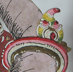 die Kugelaugen sind mit Pupille versehen, die Lippen sind fett,