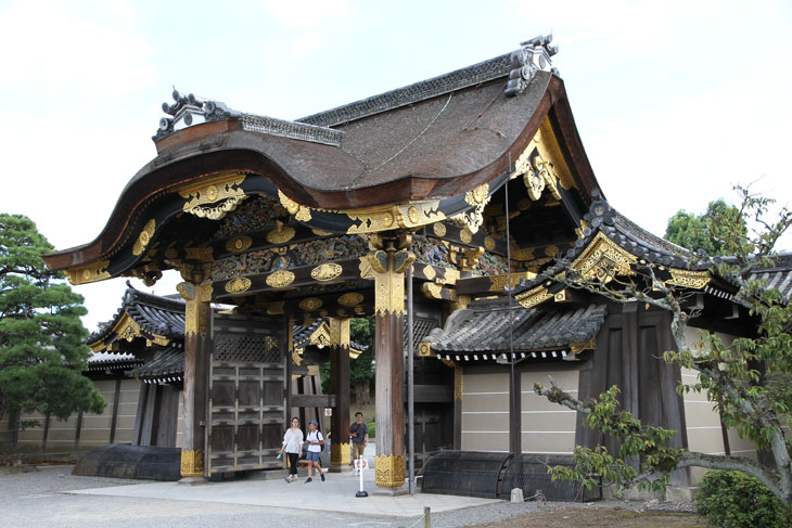 Das Tor bildet den Haupteingang zum Ninomaru-Palast und wurde 1603 in einfacherer Form errichtet und 1625 im Jahr vor dem Kaiserbesuch umgestaltet. Vermutlich wurden Teile aus der Burg Fushimi hier verbaut, dafür spricht der der Azuchi-Momoyama-Zeit verhaftete opulente Stil. Sein Erscheinungsbild heute entspricht authentisch derjenigen des Jahres 1626. Es gehört zu den besten und aufwendigsten Kara-mon in Japan, im Gegensatz zu den noch besseren Exemplaren im Daitoku-ji, im Toyokuni-Schrein und im Nishi Hongan-ji, alle drei Nationalschätze, ist dieses Karamon in der Burg Nijo jedoch "nur" als wichtiges Kulturgut klassifiziert. Der Aufwand der Dekoration, der farbig gefaßten Schnitzereien (Kraniche und Schildkröten als Symbole für langes Leben, Bambus, Pflaumenblüten und Kiefern, Päonien und Schmetterlinge, insgesamt 10 chinesische Löwen = Shishi, Drachen und Tiger, Wolken, Menschen etc., auf der äußeren Seite die Kraniche, Schmetterlinge und Blüten, auf der Innenseite die Löwen, Tiger und Drachen), der vergoldeten Metallbeschläge an den Balkenköpfen etc. entspricht seiner Bedeutung als Hauptzugang zum Palast. Der ganze Bereich über den Hauptbalken ist mit Schnitzereien gefüllt, von denen die meisten Symbole für ein langes Leben, für Glück und für Regierungsgewalt sind. Die Vielzahl heiliger Tiere hebt einerseits den hinter dem Tor befindlichen Palast und andererseits den hindurchschreitenden Gast noch einmal in der Bedeutung empor. Das Tor wurde 1975 und danach zuletzt 2012-2013 unter der architektonischen Leitung von Goto Tamaki renoviert und ist ein glanzvoller Höhepunkt der japanischen Palastarchitektur. Dabei wurden alle dreidimensionalen Schnitzereien farblich neu gefaßt, alle Metallteile abgenommen und neu vergoldet und das Dach aus Zypressenrinde ausgebessert, unter Bewahrung der noch intakten Bedeckung, wo möglich. Bei der Restaurierung kam u. a. auch heraus, daß hinter einem kaiserlichen Chrysanthemen-Wappen das Tokugawa-Wappen verborgen war, eine im späten 19. Jh. vorgenommen Anpassung, als Nijo-jo kaiserliche Villa wurde.