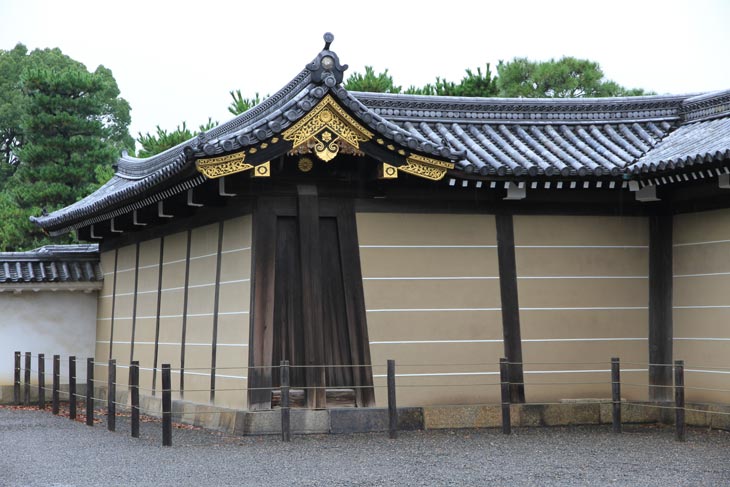 Das Tor ist in eine traditionelle Lehmmauer mit Ziegeldach eingebaut. Eine solche Mauer nennt man Tsuji-bei, rechts des Tores Higashi Tsuji-bei, links des Tores Nishi Tsuji-bei. Auf einem Steinfundament wird die Lehmmauer mit regelmäßig gesetzten vertikalen Holzbalken verstärkt, die die Dachkonstruktion tragen, damit das Satteldach das Material vor Erosion schützt. Wir sehen hier auf der Mauer die fünf horizontalen weißen Linien, die sich auch auf manchen Tempelmauern befinden. Die Anzahl der Linien gibt einen Rang an und damit die Nähe zum Kaiserhaus. Hier bei einer ehemaligen Shogun-Residenz und kaiserlichen Villa sind es die maximalen fünf Linien für den höchsten Rang. Die sich rechterhand an das Kara-mon anschließende Lehmmauer, die im Osten des Palastgeländes nach Norden führt, ist mit 6 m ungewöhnlich hoch. Auch die Lehmmauer wird als wichtiges Kulturgut geführt.