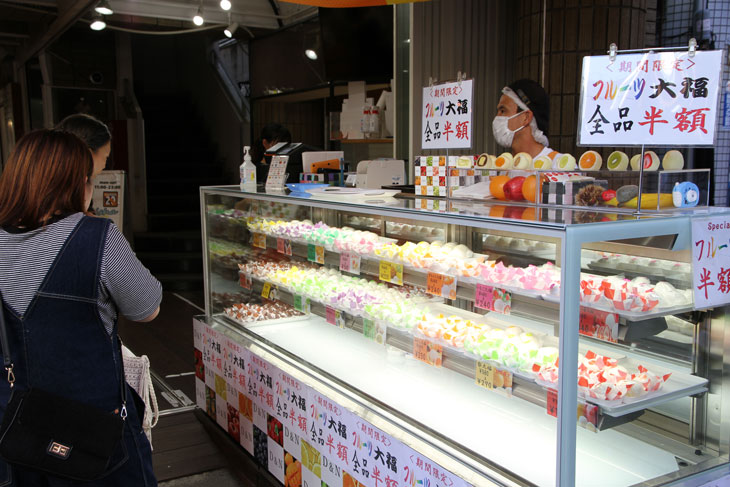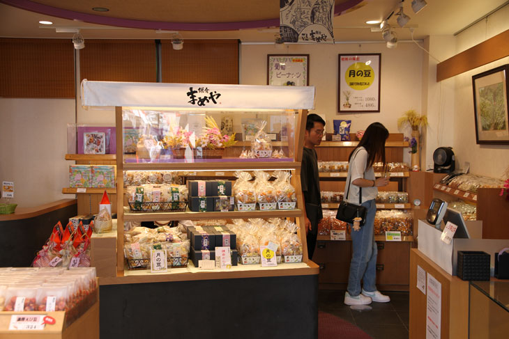 Leckereien von Kamakura Mameya: An den Auslagen steht mehrfach "Mondbohnen" (Phaseolus lunatus).