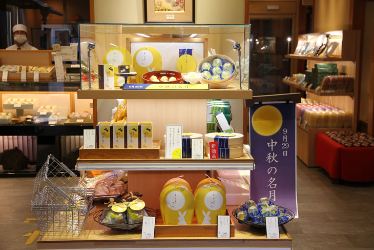 Das Schild verweist auf: 9. September 2023 = Mittherbst-Erntemond = japanisches Mondfest (O-tsukimi). Symbolik des "Kaninchens in einer mondhellen Nacht - der Mond schwebt am herbstlichen Nachthimmel - es zeigt ein fröhlich springendes Kaninchen". So steht es auf dem Werbeschild im Regal neben dem roten Schild "neuer Artikel". Untrennbar mit Tsukimi verbunden ist das Kaninchen, und das aus folgendem Grund: Wir interpretieren die Schatten und Krater auf dem Vollmond als "Mann im Mond", aber in Japan und anderen asiatischen Ländern wird darin ein Kaninchen gesehen, das Mochi stampft, traditionelle japanische Reiskuchen.