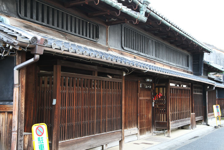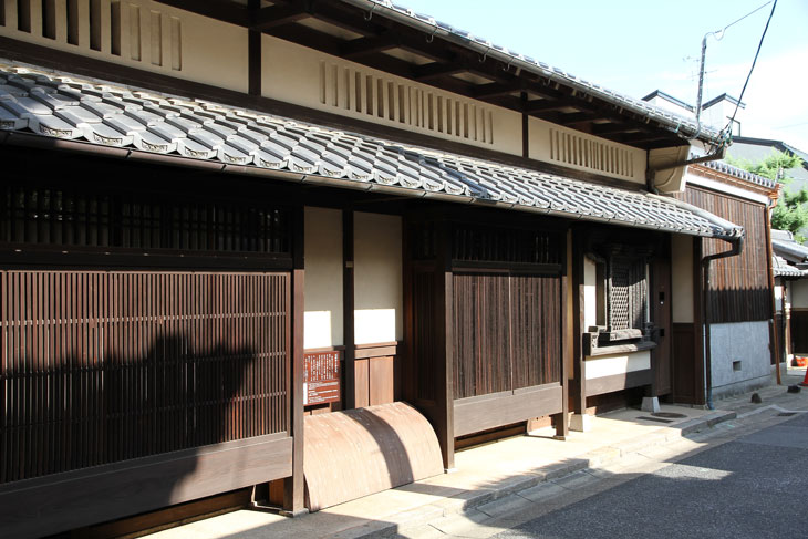Die Häuser sind so gebaut, daß die Traufe zur Straße gerichtet war. Der Dachüberstand ist gering. Dieser Typ wird Hirairi-Haus genannt. Das Gegenteil wären Häuser mit einem Giebel über dem Eingang; dieser Typ ist bei Stadthäusern nur ganz selten anzutreffen, eigentlich nur bei residenzartigen Anwesen hochgestellter Personen. Zur Straße hin bestimmen Gitter (Koshi) aus vertikalen Holzstäben (Kinusuko) das Erscheinungsbild der Front, denn zum Schutz vor Sturm und Eindringlingen sind vor allen Fenstern und Schiebewänden diese Holzgitter mit engstehenden Vertikalen angebracht. Sie erlauben zudem den Bewohnern, nach draußen zu blicken, ohne selbst gesehen zu werden, und sie filtern das grelle Sonnenlicht. Für unterschiedliche Kategorien von Händlern gab es unterschiedliche Gittertypen, anhand derer man die Läden unterscheiden konnte.