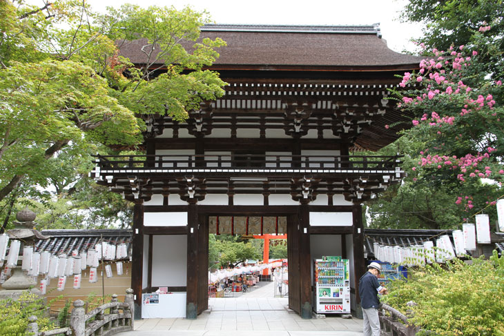 Das am Ende des Weges erreichte Haupttor des Schreines im Osten ist vom Typ eines Roumon (turmartiges Tor) mit einem scheinbaren Obergeschoß und oben umlaufender Galerie. Ungewöhnlich für einen Schrein ist, daß sich in den beiden Seitenkompartimenten Wächterfiguren (Zuijin-Kriegerfiguren, auch: Zuishin) befinden. Diese Wächtergottheiten werden als Kadomori-no-kami betrachtet, also als Götter, die über die Toröffnungen wachen. Typischerweise werden sie mit Pfeilen und Bogen dargestellt. Sie sind die Shinto-Entsprechung der Nio in Tempeltoren. Im einzelnen werden sie als Yadaijin (Minister mit Pfeilen) und Sadaijin bezeichnet. Typischerweise wird Sadaijin, hier schwarz gekleidet, als älterer Herr mit Silberbart und mit offenem Mund dargestellt, Yadaijin als jüngerer Mann mit geschlossenem Mund, hier rot gekleidet. Beide tragen Hoftracht mit einer Robe mit extrem weiten Ärmeln, Kenei no kanmuri als hochgesteckte Haartracht mit Oikake. Beide tragen ein Schwert. Ein solches Tor wird auch als Zujin-mon oder als Yadaijin-mon bezeichnet. Ganz ähnlich finden wir das im Yasaka-Schrein und im Goryo jinja (Kamigoryo jinja), beide ebenfalls in Kyoto. Dieses Roumon wurde 1980 renoviert, ebenso die angrenzende Lehmmauer.