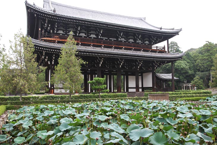 Die Süd-Nord-Hauptachse der Großgebäude beginnt im Süden mit dem viereckigen Lotusteich von 37 m Breite und 17 m Länge, über den in der Mitte der Hauptweg geführt wird, direkt auf das San-mon zu. Die kleine, 6 m lange, flach gebogene Brücke ist zwischen zwei viereckigen Podesten von 6,50 m Breite aufgespannt. Besonders schön ist dieser Bereich im Juli, wenn der Lotus in voller Blüte steht. Das zweistöckige San-mon ist eines der größten und schönsten seiner Art; vor allem ist es das älteste und größte San-mon eines Zen-Klosters in Japan, denn es wurde in der mittleren Muromachi-Zeit im Jahr 1425 erbaut (es gibt zwar auch andere riesige Tore, wie z. B. im Chion-in, aber die stehen nicht in Zen-Klöstern). Mit den beiden seitlichen einstöckigen Treppenaufgängen (Sanro, Sanrou) mißt es 46 m Breite. Besagte Treppenaufgänge sind im Kirizuma-Stil mit Hongawarabuki-Dach. Die Höhe des Tores beträgt 22 m. Das Hongawarabuki-Dach im Irimoya-Stil mißt 38 x 23 m. Stilistisch finden wir Elemente des Daibutsu-Stils und des Wayo-Stils. Das Tor ist als Nationalschatz klassifiziert. Es ist fünf Interkolumnien (Ken) breit mit drei Durchgängen in der Mitte. Über dem Durchgang ist eine horizontale Schrifttafel angebracht mit den Kanji für "Myouunkaku". Früher waren Zen-Klöster für Frauen verschlossen. Im Obergeschoß werden Figuren eines Buddha Shakyamuni (seltene Darstellung mit linker Hand auf der Rechten, eine Krone auf dem Haupt, Hokan Shaka Nyorai Zazo) aufbewahrt. Er wird flankiert links von Gakkai Sonja und rechts von Zaizen Doji und von 16 seiner Arhat (Juroku Rakan). Die Figuren sollen aus der Heian-Zeit stammen. Außenherum befinden sich Gohyaku Rakan. Die Decke des Raumes ist von Mincho (= Cho-Densu, 1352-1431) und seinem Schüler Kan-Densu ausgemalt worden. Das Tor ist normalerweise geschlossen und nur im November für Besucher geöffnet, wenn es als Aussichtspunkt zum Betrachten des Herbstlaubes dient. Der Name San-mon ist eine Abkürzung für San-gedatsu-mon, Tor der Dreifachen Befreiung. Diese setzt sich aus drei Abschnitten zusammen, die die drei Stadien der Erreichung des Nirwana symbolisieren, nämlich die Befreiung von Wünschen, die Befreiung von Bindungen und die Vereinigung mit der Leere. Das San-mon erfuhr 1969-1978 eine 2,5 Mio Dollar teure Komplettrestaurierung, bei der das komplette Tor auseinandergenommen, repariert und wieder zusammengesetzt wurde. Ihr verdanken wir, daß das Tor heute noch so aussieht, wie es bei dem Wiederaufbau des Tempels unter Ashikaga Yoshimochi geschaffen wurde. Nur einmal gab es eine größere Reparatur, nachdem das Erdbeben, das die Burg Momoyama einstürzen ließ, auch dieses Tor beschädigt hatte, was anschließend durch Toyotomi Hideyoshi repariert wurde. Aus dieser Zeit (1585) stammen auch die vier großen Eckstützen mit viereckigem Querschnitt, die das ausladende Dach mittragen. Sie heißen deshalb Taiko Bashira, nach dem Titel Taiko für Toyotomi Hideyoshi.