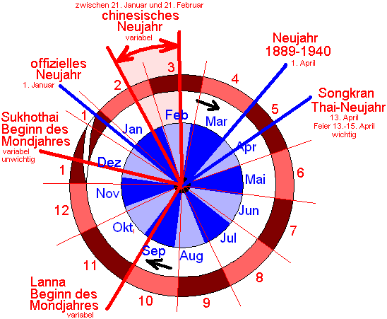 In Thailand werden verschiedene Neujahrsfeste gefeiert: Wer will, kann in einem unserer westlichen Jahre viermal Neujahr in Thailand feiern! In der folgenden Graphik sind die Neujahrsfeste für ein willkürliches Jahr illustriert. Dabei bezieht sich die Farbe blau auf den Sonnenkalender Suriyakati, die Farbe Rot auf den Mondkalender Chantarakati. Im inneren Ring sind die Monate des gregorianischen Kalenders, im äußeren Ring Mondmonate. Die dünnen radialen Striche markieren die Monatsgrenzen. Die dicken Striche markieren die verschiedenen Neujahrstage für das Jahr: