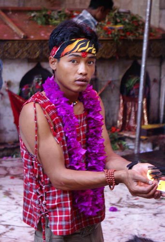 Kali wird mit Blutopfern in Verbindung gebracht. Der Glaube besteht darin, dass nur durch Zerstörung etwas Neues entstehen kann. Kali bedeutet die göttliche Kraft der Zerstörung und zugleich die Gewährung von Gnade und Vertreibung von Angst. Kali zerstört das, was den Menschen getrennt hält von seinem göttlichen Ursprung. Liebe zu Kali zerstört die Todesangst, die den Fortschritt auf dem spirituellen Pfad verhindert. Sie erinnert den Sucher ständig daran, daß Erlösung nicht erreicht werden kann, so lange ihn Zeit, Raum und menschliche Begrenzungen binden. Sie zerstört diese Begrenzungen und bringt Freiheit. Kali als göttliche Kraft bekämpft alles, was ungünstig ist oder nicht mit Gott in Verbindung steht, wie z. B. Eingrenzungen, Barrieren für die Erleuchtung, Unwissenheit oder Falschheit. Früher wurden der Kali Menschenopfer dargebracht, heute verboten, und in den Kali geweihten Tempeln in Indien und Nepal wie hier in Dakshinkali werden noch immer Tieropfer (Büffel, Ziegenböcke, Hähne - je nach Wohlstand der Familie und Höhe des Festes, aber immer männlich und unkastriert, also keine Ochsen) dargebracht. Kalifiguren zeigen die Göttin, wie sie auf einem männlichen Wesen herumtrampelt, der Legende nach ihr Ehemann Shiva. Blut in jeglicher Form ist in den meisten Tempeln verboten, nicht so hier, wo es an Feiertagen in Strömen fließt. Die mitgebrachten Hähne werden erst mit Wasser besprenkelt und gesegnet, dann werden sie über einer Rinne mit einem Messer geschlachtet, während sich am Boden ein Blütenmeer mit dem Blut vermischt, in dem die Gläubige, Priester und Helfer barfuß herumstapfen. Mit dem versprengten Blut wird die Göttin milde gestimmt, der abgeschnittene Kopf verbleibt im Tempel, während die Gläubigen das Tier selbst zum Verzehr wieder mit nach Hause nehmen. Die Speise ist jetzt "Prasad", geheiligte Speise, da die Göttin davon genommen hat.