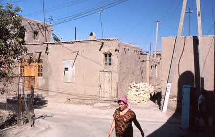 Holz: Zwischendecken und das Flachdach ruhen auf Balken, die die Wände durchstoßen und wenige Zentimeter bis über 1 Meter herausragen. In der Regel werden komplette Rundhölzer verbaut, denn der Baumreichtum ist nicht so, daß man sich das Sägen von Vierkanten und den Verschnitt leisten könnte. Natürlich wird heute intensiver bewässert als früher, aber Holz ist immer noch kostbar. Für jedes Brett, das man haben möchte, muß man bewässern und vor allem entwässern, evtl. jahrelang das Gelände entsalzen, ehe der Baum überhaupt dort wachsen kann. Entsprechend werden auch die hölzernen Elemente eines Hauses als etwas sehr Kostbares behandelt und entsprechend verziert. Insbesondere die Türen sind in Khiva eine Augenweide, in ansonsten schmucklosen einfachen kubischen Bauten wird hier an dieser einzigen Stelle nach außen Schmuck gezeigt, und dabei vom Feinsten. Wenn man sieht, welch exquisiten Schnitzereien die Türen in einem einfachen Lehmhaus zieren, kann man ermessen, welche Kostbarkeit eine geschlossene Türenfläche aus Holz für die Besitzer war. Gleiches gilt für Holzsäulen eines ggf. vorhandenen Iwans. Andererseits sind im Vergleich der Materialien Lehm, Stroh, luftgetrocknete Ziegel die hölzernen Elemente die beständigsten des Hauses.