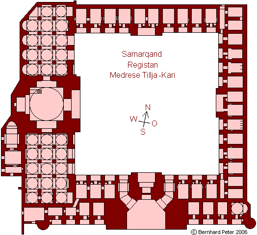 Zwischen den einander genau gegenüber liegenden Medresen, der Ulugh Beg Medrese und der Shir Dor Medrese, liegt das dritte bedeutende Bauwerk des Registan-Ensembles, das jüngste von den dreien, die Tillja Kari Madrasa (Tillakori madrasasi). In Architektur und Funktion weicht es deutlich von den beiden anderen ab. Zu Ulugh Begs Zeiten war an dieser Stelle eigentlich eine Karawanserei (die Mirzoi-Karawanserei), von der sich aber keine sichtbaren Spuren erhalten haben. Die Tillja Kari-Medrese wurde rund 220-240 Jahre nach der Ulugh Beg Medrese gebaut, nämlich 1646-1660. Noch mehr Jahre waren vergangen, seit Timur die Freitagsmoschee von Samarqand, die Bibi Khanum Moschee hat errichten lassen. Diese war schon lange ein Opfer ihrer überhasteten Errichtung, ihrer gewaltigen Dimensionen und ihrer instabilen Bautechnik geworden sie war seit längerem schon eine Ruine, und Samarqand hatte keine intakte Freitagsmoschee, keine Hauptmoschee, denn auch die Alikeh Kukeltash Moschee war unbrauchbar geworden. Dies sollte sich unter dem Usbeken-Herrscher Alchin Yalangtush Bahadur aus dem Geschlecht der Shaibaniden ändern, das ist derselbe Herrscher, unter dem eine Dekade früher die Shir Dor Medrese erbaut wurde. Er verfolgte mit dem Bau der Tillja Kari ein duales Konzept: Das Bauwerk sollte sowohl als Medrese als auch als Freitagsmoschee dienen. Das spiegelt auch die Architektur wieder: Der gesamte Westflügel ist eine große Hallenmoschee mit zentralem Kuppelraum und nördlich und südlich daran angrenzenden großen überkuppelten Hallen, die sich auf den Hof hin öffnen. Und um dem Andrang der Gläubigen beim freitaglichen Gemeinschaftsgebet Herr zu werden, wurde der gesamte Hof mitbenutzt. Die Gebäudeflügel im Norden Osten und Süden dagegen sind Medresenflügel mit den typischen kleinen Studentenzellen. Zur Funktion als Freitagsmoschee paßt auch die Position am Kopfende des Registan-Platzes, die Lage des Eingangsportales im Fluchtpunkt der Gesamtgeometrie des Ensembles.